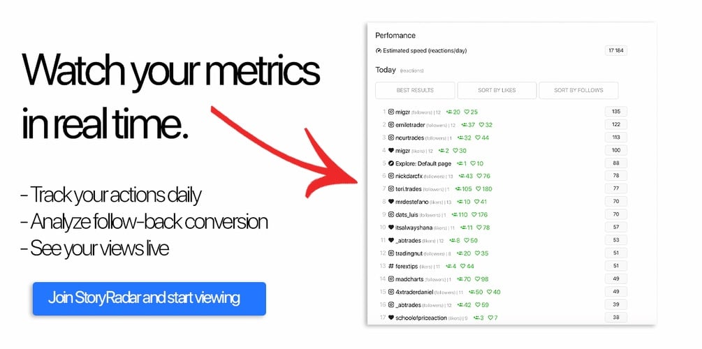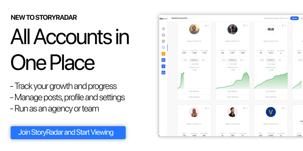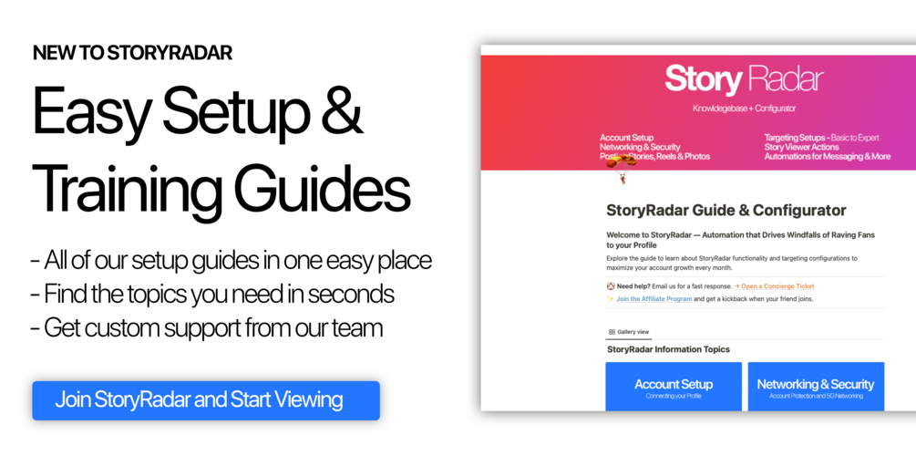 Results shown are based on a pool of 2891 clients that had at least 30 days of stats tracking. StoryRadar results are not guaranteed. Using software in high-risk automations can result in restrictions, please follow our safety guide before using StoryRadar. We are not responsible for misconfigurations or user errors that may result in issues with your profiles. If you have questions please ask our Support team for help. If you are using other similar services or software with your attached profiles, you are not eligible for StoryRadar and must terminate those programs before using this software. Tropica Marketing LLC does not make any assurances on increased revenue, lead generation or account growth as StoryRadar is a self-serve software, all results are the by-product of client inputs through software configuration, profile quality and content output. You must agree to our Terms of Service before using.