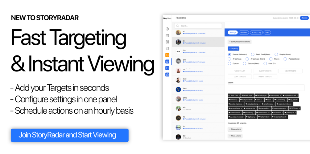 StoryRadar views targeted stories with your account, skyrocketing your exposure by voting and answering story polls, sliders, quizzes and question boxes.